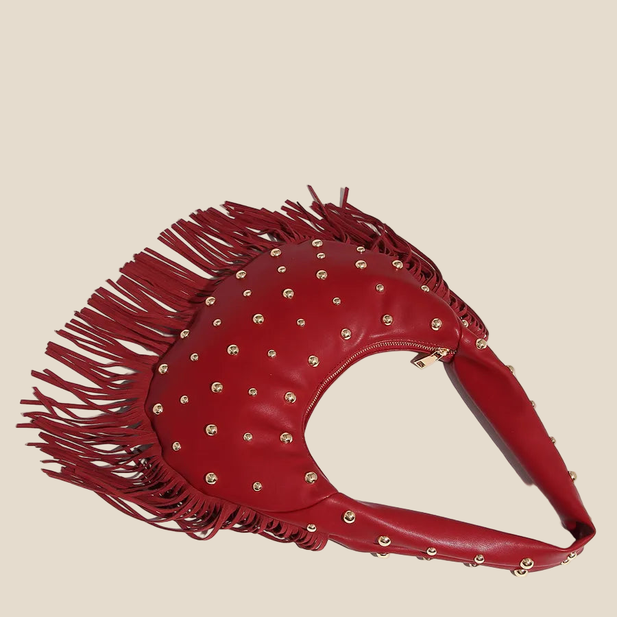 Elegancia y carácter se unen en el bolso Eclipse, una pieza de diseño en forma de media luna con tachuelas doradas y flecos fluidos que aportan movimiento y estilo. Fabricado en piel sintética premium (PU), combina resistencia y sofisticación. Su asa única al hombro lo hace cómodo y versátil, ideal tanto para el día como para la noche.